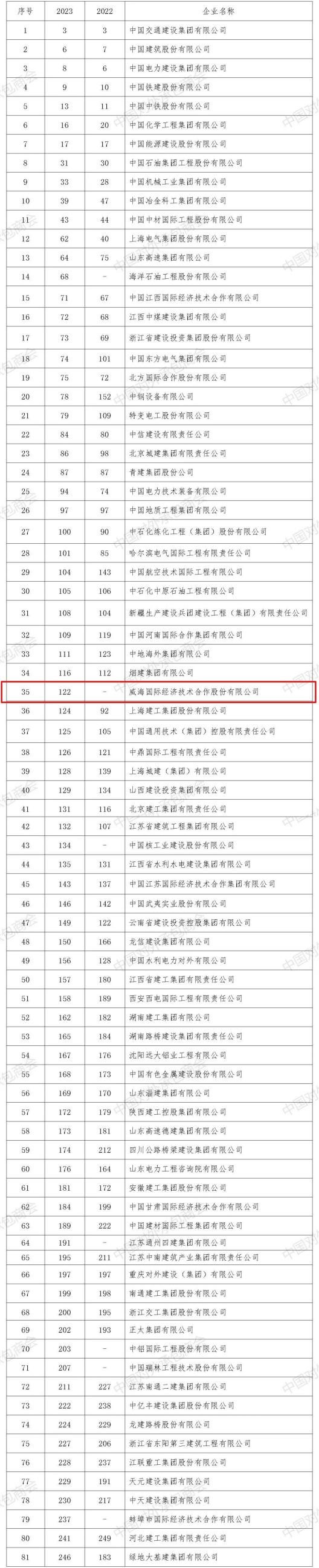 On August 23, Engineering News Record (ENR)s 2023 Top 250 International Contractors was released. Our company has once again made the list, ranking 122nd overall and 35th among Chinese enterprises on the list.