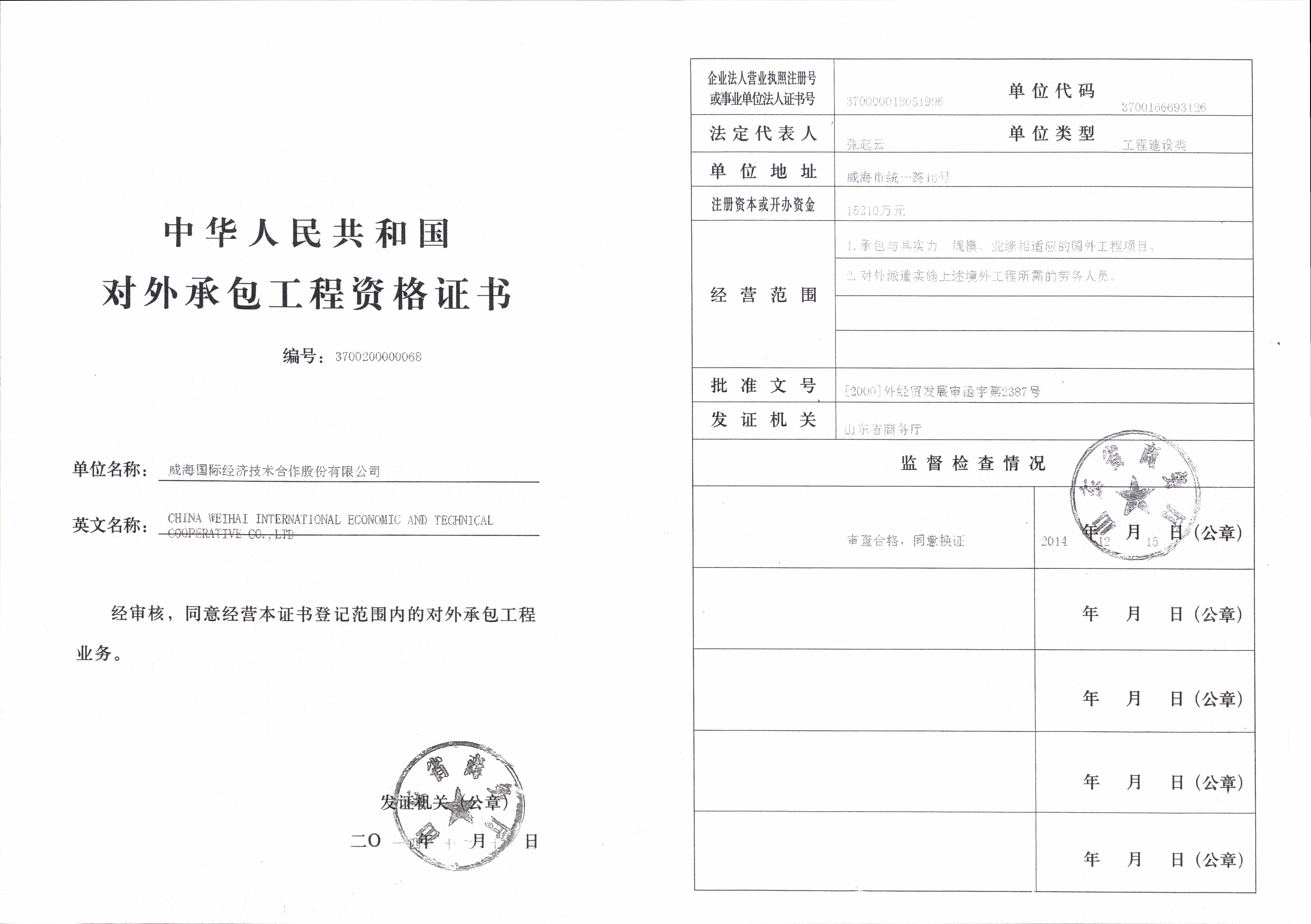 Tous droits réservés.:Weihai International Economic & Technical Cooperative Co.,Ltd(c)N°16, rue de Tongyi, ville de Weihai, Chine 魯ICP備12002982號-3 Tél:86-0631-5233588 Fax:86-0631-5224345 魯公網(wǎng)安備 37100202000269號 Soutien technique:L'audition de logiciel