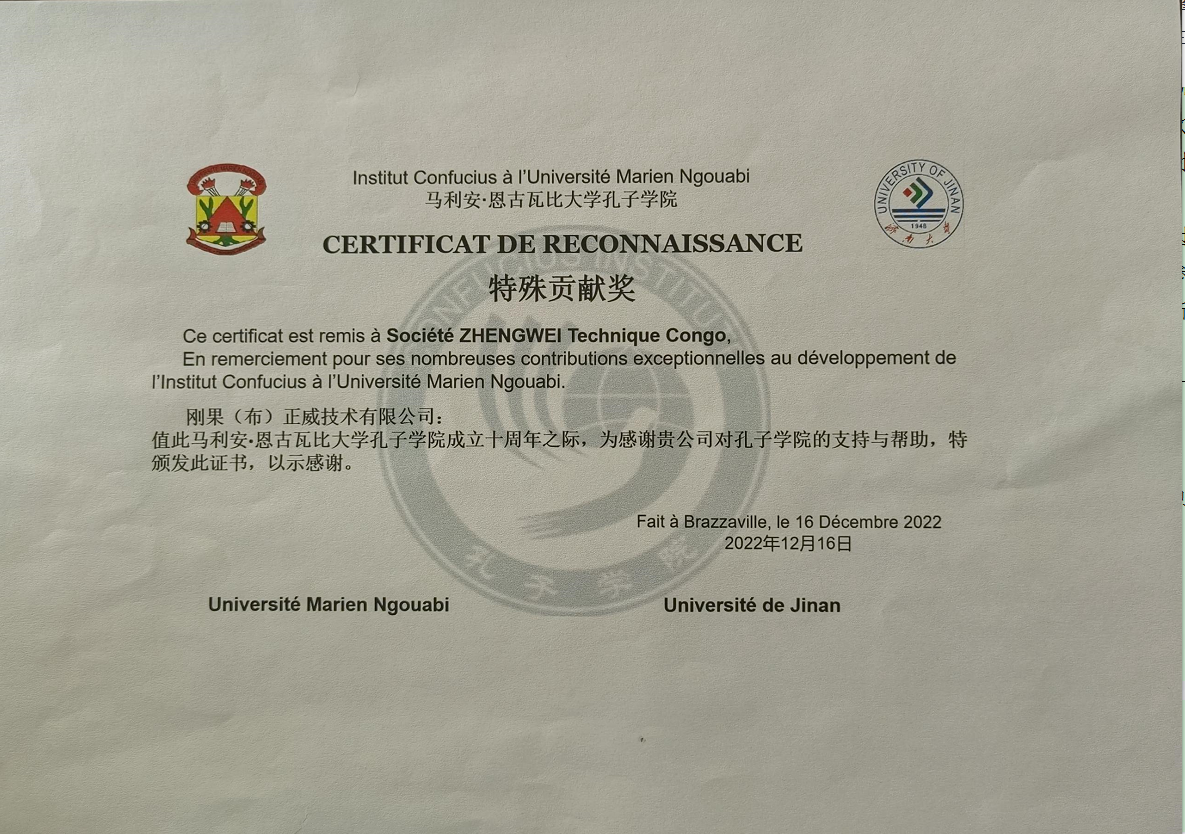 Le 10ème anniversaire de la création de l'Institut Confucius à l'Université Ngouabi en République du Congo - La Société ZHENGWEI Technique Congo a remporté le Certificat de reconnaissance