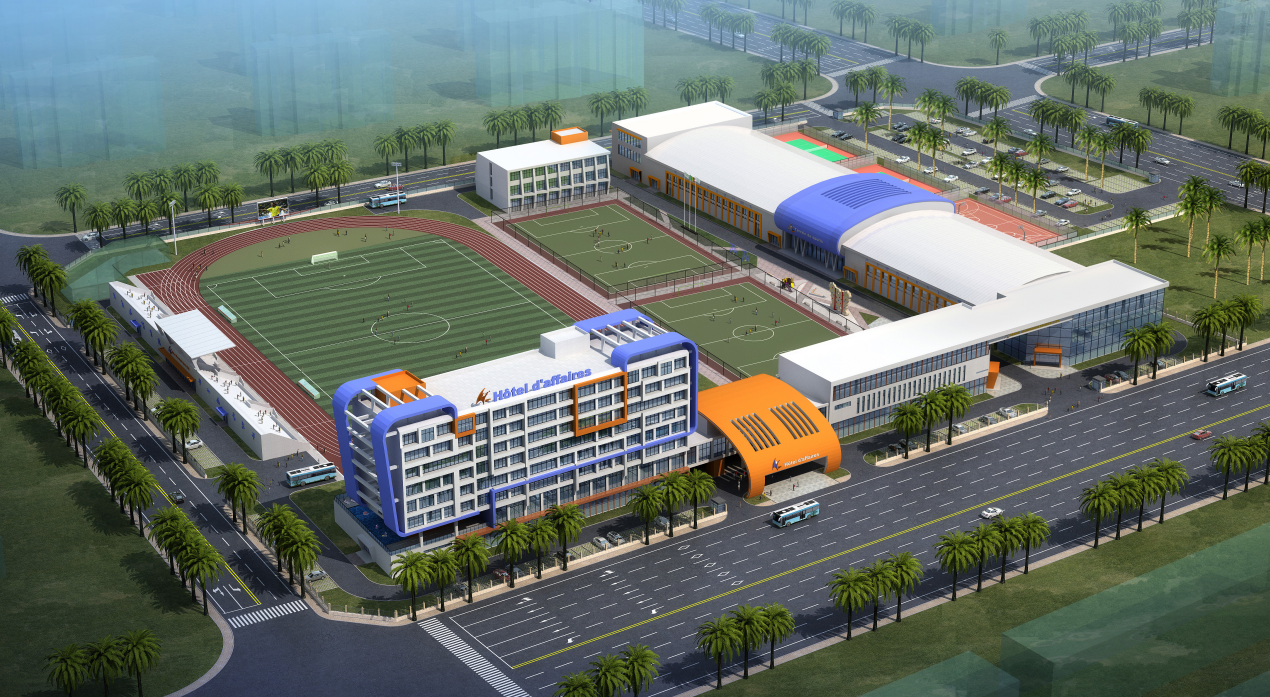 Présentation du projet :Le projet vise à construire, à Dakar, capitale de République de Sénégal, une nouvelle cité sportive qui intègre un h?tel quatre étoiles, un stade compréhensif, un terrain de football en plein air, un terrain de tennis, un terrain d’entra?nement de football, un terrain de basketball en plein air, des appartements pour athlètes, un batiment de restauration et d’enseignement et un parking, dont la surface batie totale est de 30 158 m2.