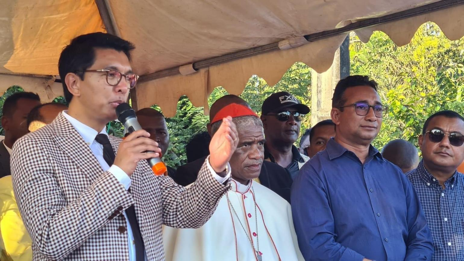著工式に出席し、挨拶するラジョリーナ大統(tǒng)領(lǐng)(左から1人目)