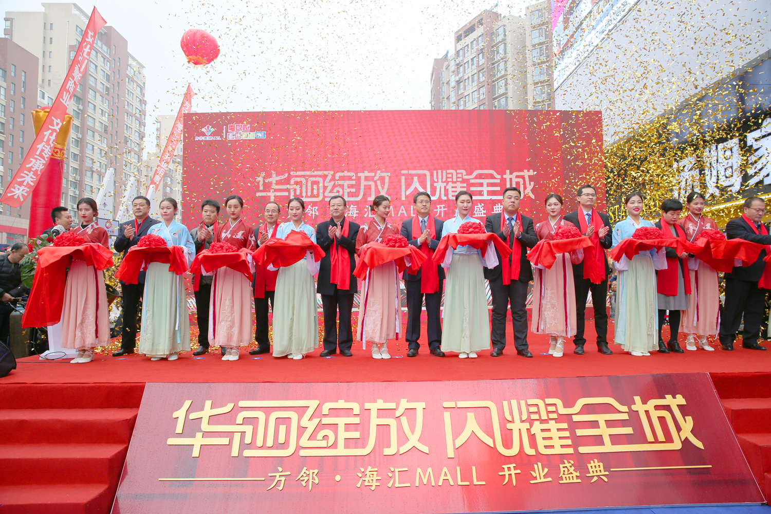 隨著彩帶飛舞、鑼鼓齊鳴,10位嘉賓共同上臺為方鄰·海匯MALL剪彩。隨后,在現(xiàn)場所有人的簇擁和注目下,吳志男、趙海英來到方鄰·海匯MALL主入口,一起揭下紅彤彤的幕布,如鮮花盛開般的LOGO和方鄰·海匯MALL幾個大字華麗亮相!