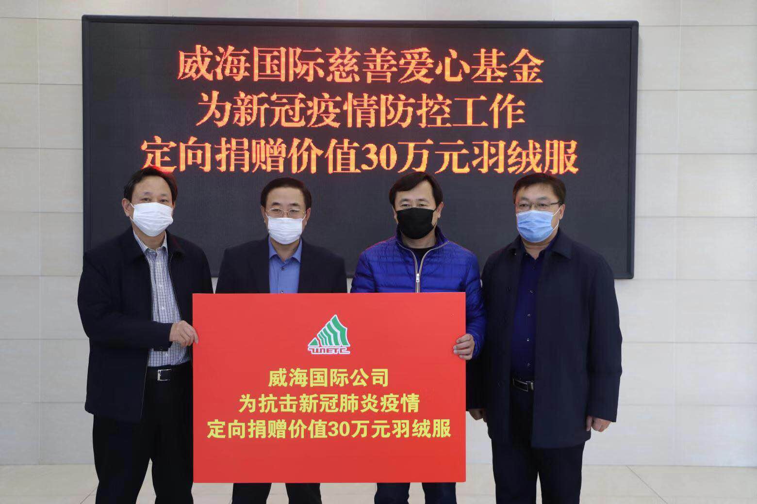 2月5日下午,威海國(guó)際公司慈善愛心基金為新冠肺炎疫情防控工作定向捐贈(zèng)價(jià)值30萬(wàn)元的羽絨服,助力威海市新冠肺炎疫情防控工作的開展。